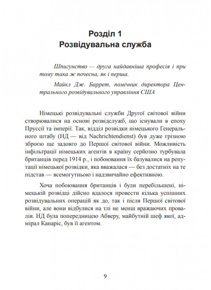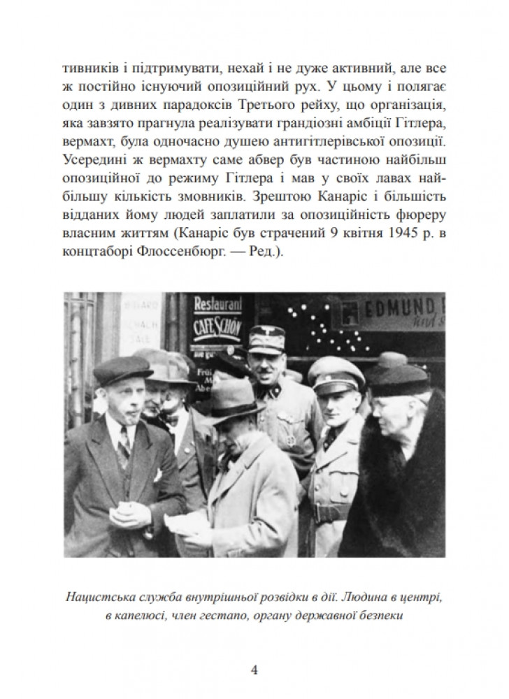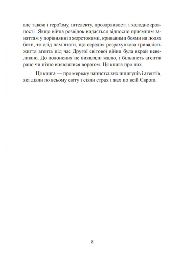 Розглядає організацію мережі нацистських шпигунів і агентів, що діяли в Британії, Франції, Скандинавських країнах і в Рaдянському Союзі, їхні успіхи і провали, а також діяльність груп «Червона трійка» і «Червона капела», що працювали на рaдянську розвідку. Особливу увагу автор приділяє протистоянню розвідок і таємній війні між двома найважливішими фігурами розвідслужб Третього рейху, Рейнхардом Гейдріхом і Вільгельмом Канарісом.