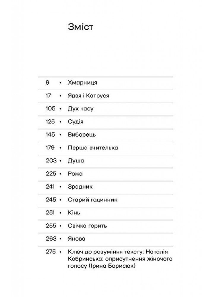 Кобринська показує, як навіть у складних обставинах людина знаходить гідність і силу. До збірки ввійшли ключові твори письменниці — «Янова», «Виборець», «Хмарниця», а також оповідання про дітей і світ, який вони відкривають для себе: «Зрадник», «Старий годинник» і «Перша вчителька».