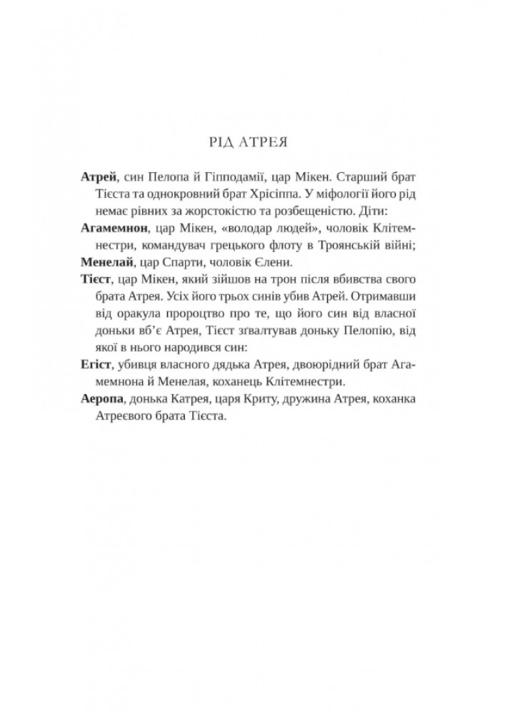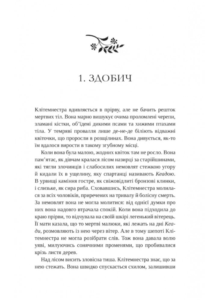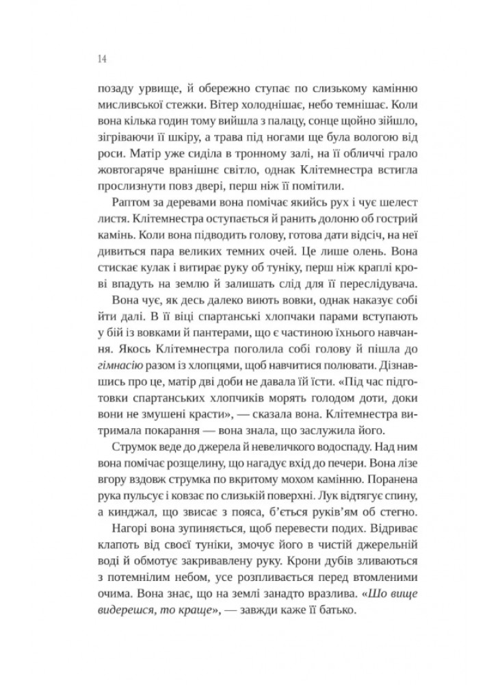 Зраджена, змучена й позбавлена голосу, героїня надто довго смиренно споглядала за тим, як знищують усе, що було для неї важливе… Та прийшла нова пора. У світі, що керується чоловіками, донька спартанського царя буде виборювати собі владу, допоки вороги не палатимуть у вогні помсти й болю.