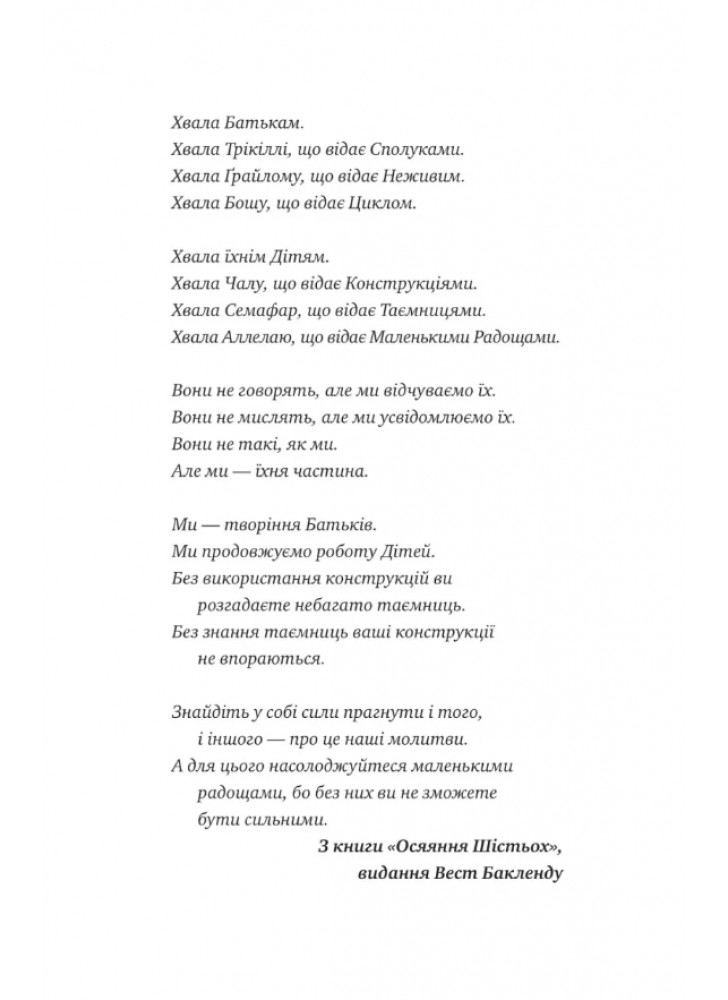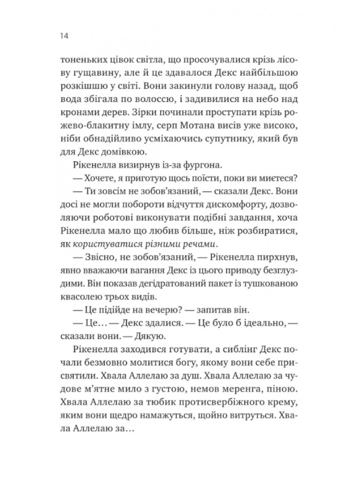 Книга «Молитва за сором’язливі крони» — це затишна наукова фантастика про постапокаліптичне утопічне суспільство від американської авторки Бекі Чемберс. Чайний монах сиблінг Декс і робот Рікенелла продовжують пригоди.