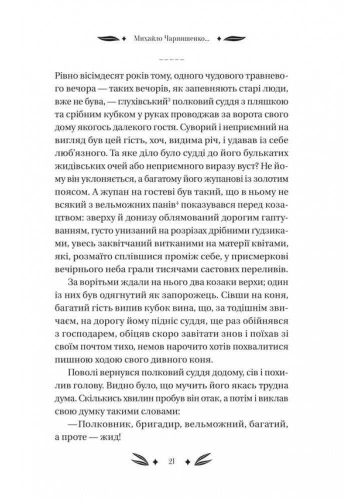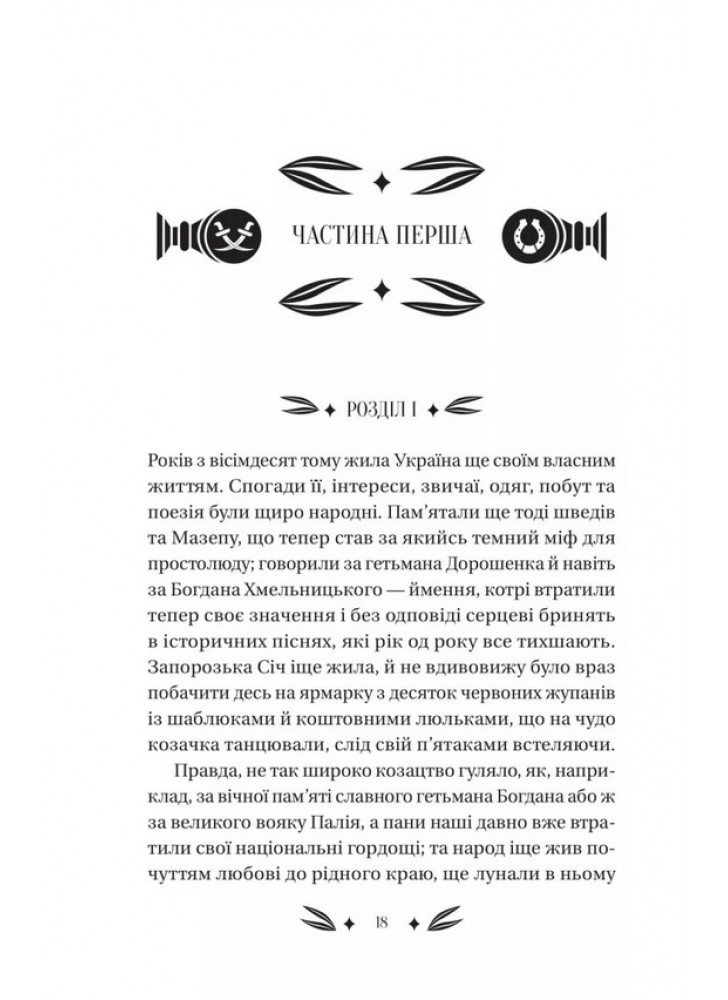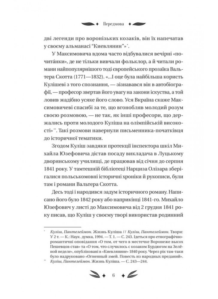 Еще одно название романа — «Украина восемьдесят лет назад», транслирующее сущность национальности, старосветский быт и законы времен упадка Гетманщины. Рукопись Кулиша позволяет читателям познакомиться с рядом ярких и многослойных персонажей, действия которых вызывают бурю эмоций и безудержное желание узнать их роль в сюжете. В исторических декорациях отражаются главные мотивы героев, их рвения и намерения. Своим наследием художник воспроизводил генетическую сущность украинцев, фиксируясь на чертах мужества, героизма и военной верности.