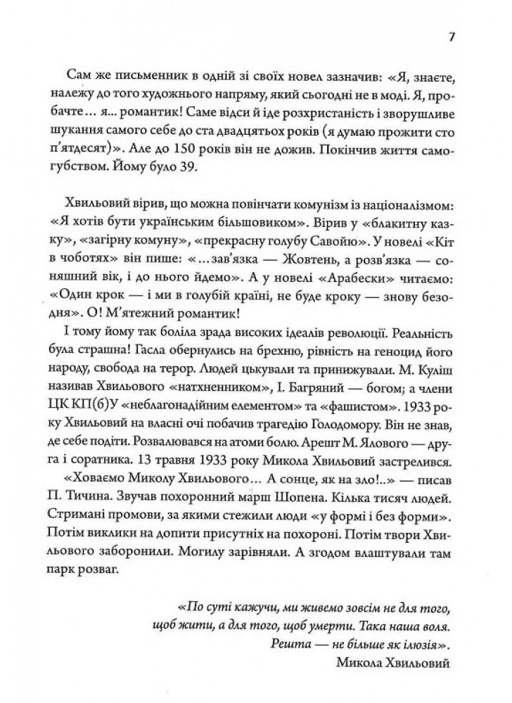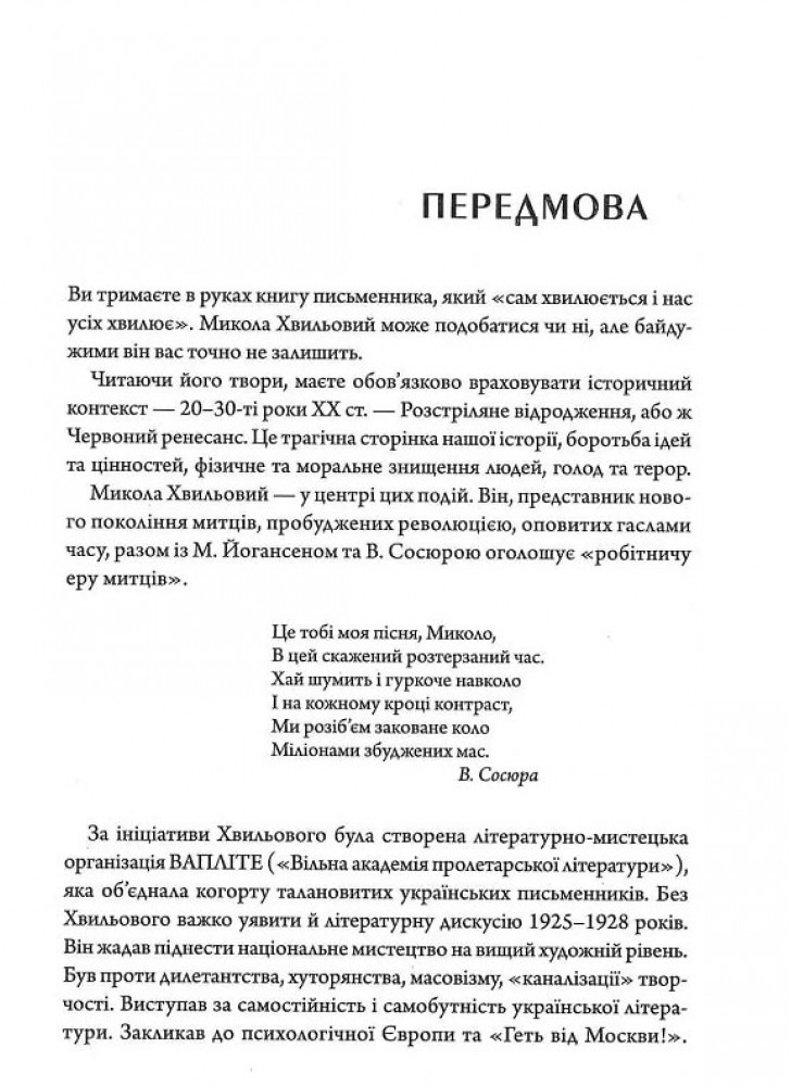 Вы держите в руках книгу писателя, который сам волнуется и нас всех волнует. Николай Хвылевой может нравиться или нет, но безразличными он вас точно не оставит. Читая его произведения, должны обязательно учитывать исторический контекст – 20-30-е годы 20 в. – расстрелянное возрождение, или же красный ренессанс.