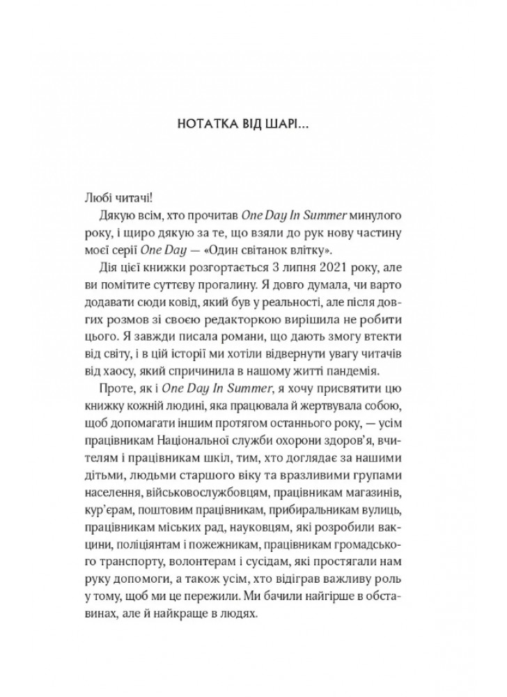 Книга «Один світанок влітку» — це теплий, іронічний та глибоко емоційний літній роман у дусі чикліт від Шері Лоу, шотландської письменниці й авторки бестселерів New York Times. Мисткиня створила сюжет, що хронологічно охоплює лише добу, розповідаючи про один день із життя чотирьох персонажів.