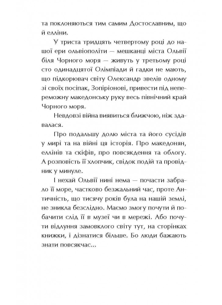 А розповідає її хлопчик, свідок подій та провідник у минуле. І хай Ольвії нині нема — її забрали море та безжальний час, — проте античність не зникла. Маємо змогу побачити її слід, почути відлуння замовклого світу і дізнатися більше. Бо люди прагнуть знати повсякчас.