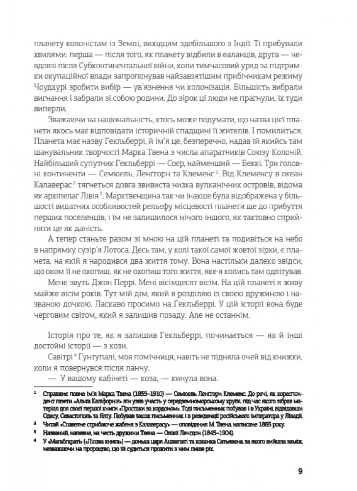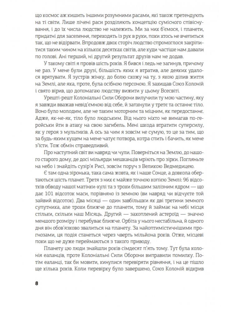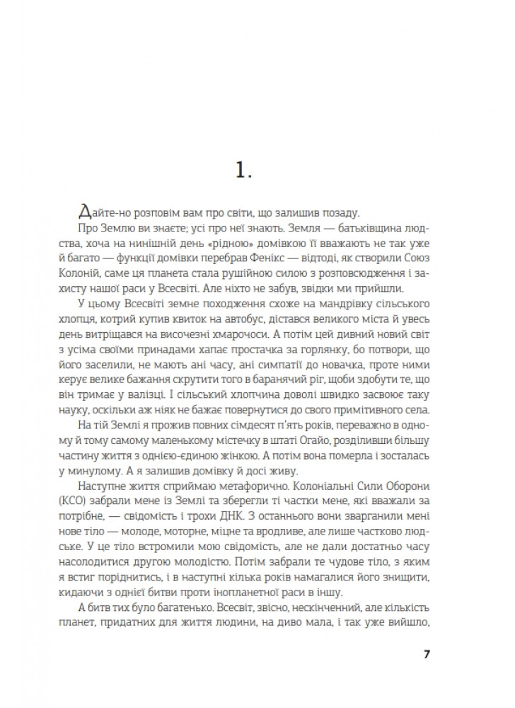 Я захищав Союз Колоній і свято вірив, що допомагаю людству вижити у цьому Всесвіті. Мене звуть Джон Перрі. Мені вісімдесят вісім. На цій планеті я живу майже вісім років. Тут мій дім, який я розділяю із своєю дружиною та названою дочкою. Ласкаво просимо на Гекльберрі. У цій історії вона буде черговим світом, який я залишив позаду. Але не останнім.