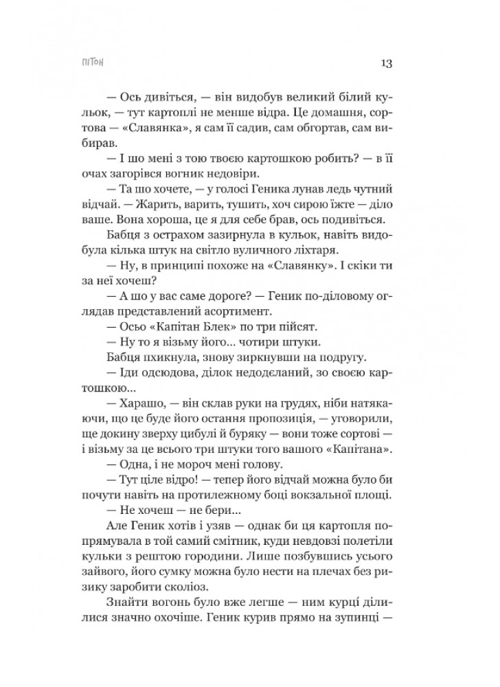 "Пітон" — психоделічний роман, у якому реальне межує з вигадкою, сюжет відкриває перед читачем шлях людини від химерної мрії до трагедії. За що боролася українська молодь під час Революції Гідності? Чим жили та про що мріяли студенти? Перше кохання і розчарування, пошук себе, боротьба з фобіями й комплексами, самопізнання та юнацький максималізм — усе це доводиться переживати головному герою.