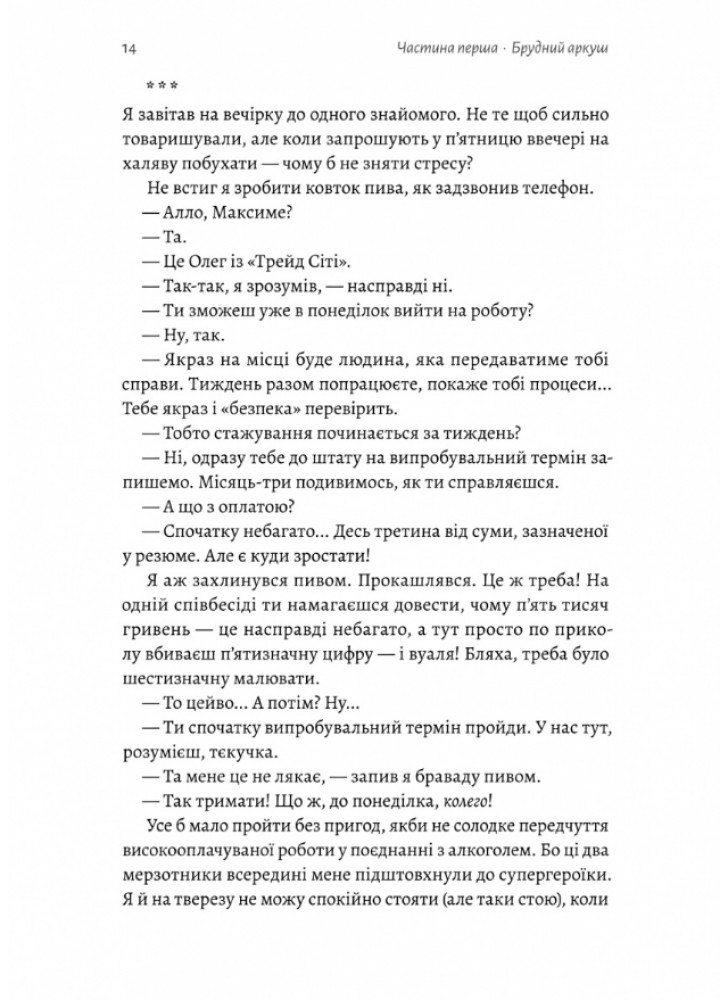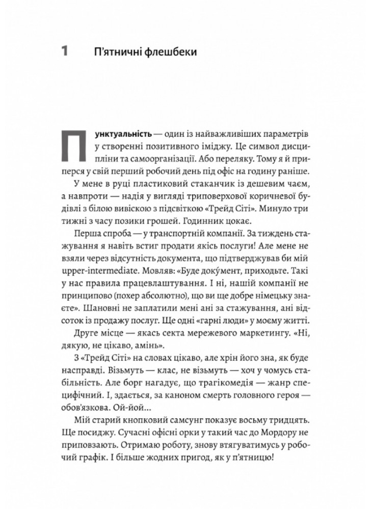 Скільки принижень треба проковтнути, аби остаточно втратити себе? І в який момент людина перетворюється на сірий офісний планктон? Це сатирична, зла і до болю впізнавана трагікомедія офісної реальності на зламі десятиліть, де, щоб отримати бажане, доведеться втратити все, що було по-справжньому важливим. У цій книжці немає геройства. Тільки виживання з дешевою кавою у руках і клятим будильником щоранку. І світла в кінці тунелю теж немає. Це просто офіс.