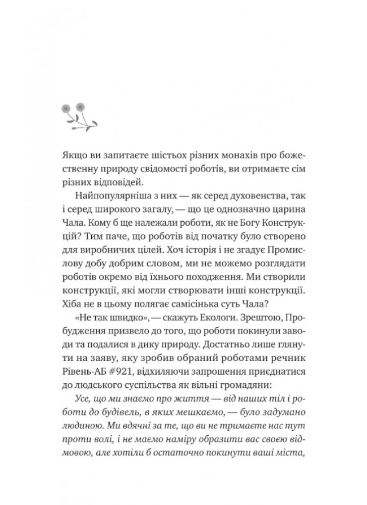 Перша книга дилогії Monk and Robot. Затишна НФ, що розкриває людську сутність. Роман «Псалом для дикостворених» Бекі Чемберс написала в піджанрі наукової фантастики — соларпанк. Тому історія пронизана екзистенціальними роздумами та філософією співіснування природи й технологій. Чи існує кордон між вигадкою та реальністю, що змушує особистість до кардинальних змін і спонукає до безперервного пошуку сенсу життя? Емпатія притаманна лише людям чи роботи також здатні на почуття?