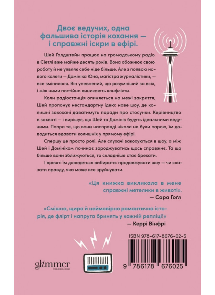 Двоє ведучих, одна фальшива історія кохання - і справжні іскри в ефірі. Шей Ґолдштейн працює на громадському радіо в Сіетлі вже майже десять років. Вона обожнює свою роботу й не уявляє себе ніде більше. Але з появою нового колеги — Домініка Юна, магістра журналістики, — все змінилося. Він упевнений, що розумніший за всіх, і між ними постійно виникають конфлікти.