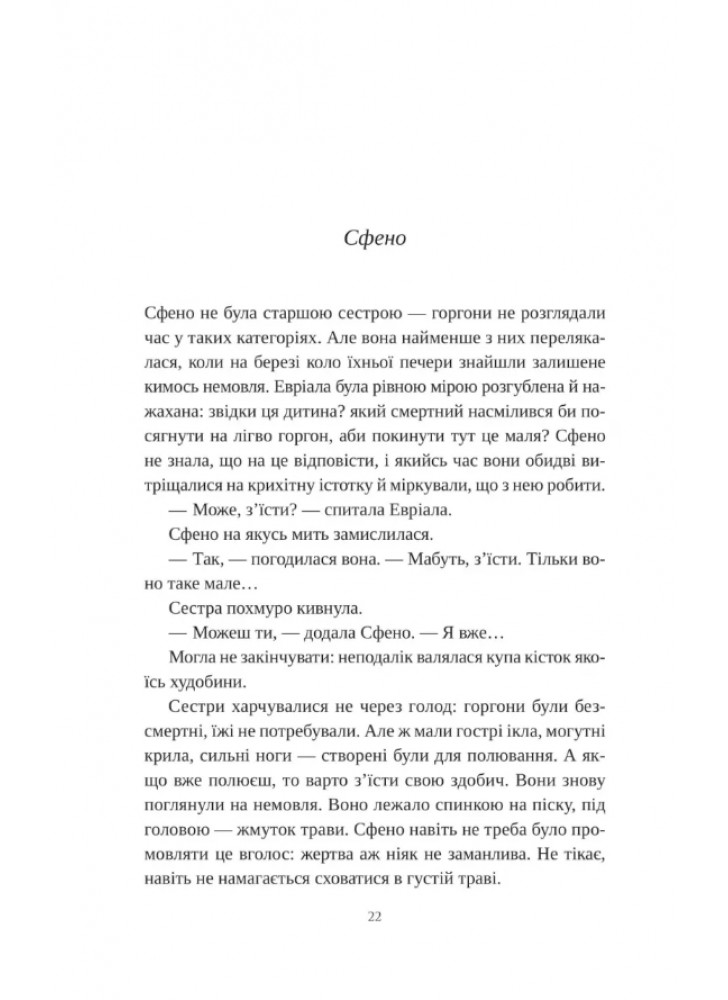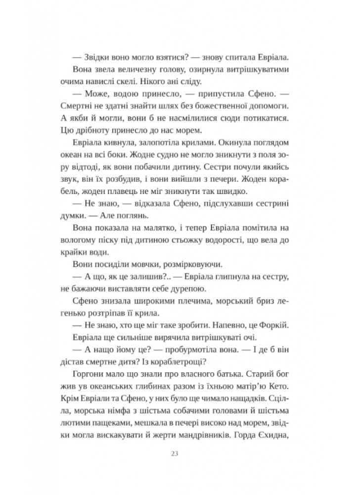 Читачі спостерігатимуть за долею героїні із самого народження. Сфено та Евріала обирають піклуватися про смертну сестру. У них є потужні кігті й крила, які роблять їх незрівнянними у полюванні та битві. Натомість новонароджена має цілком людський вигляд, хіба невеличкі крила видають походження. Виплекана горгонами, Медуза стає прекрасною дівчиною, що привертає увагу Посейдона й стає жертвою його сили у храмі Афіни.