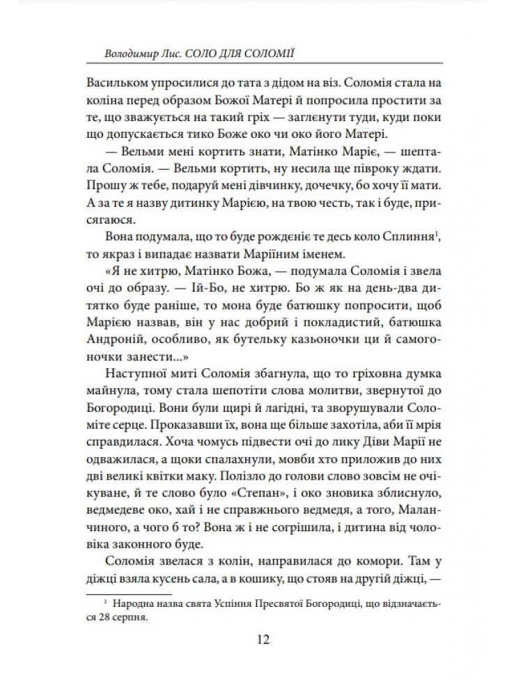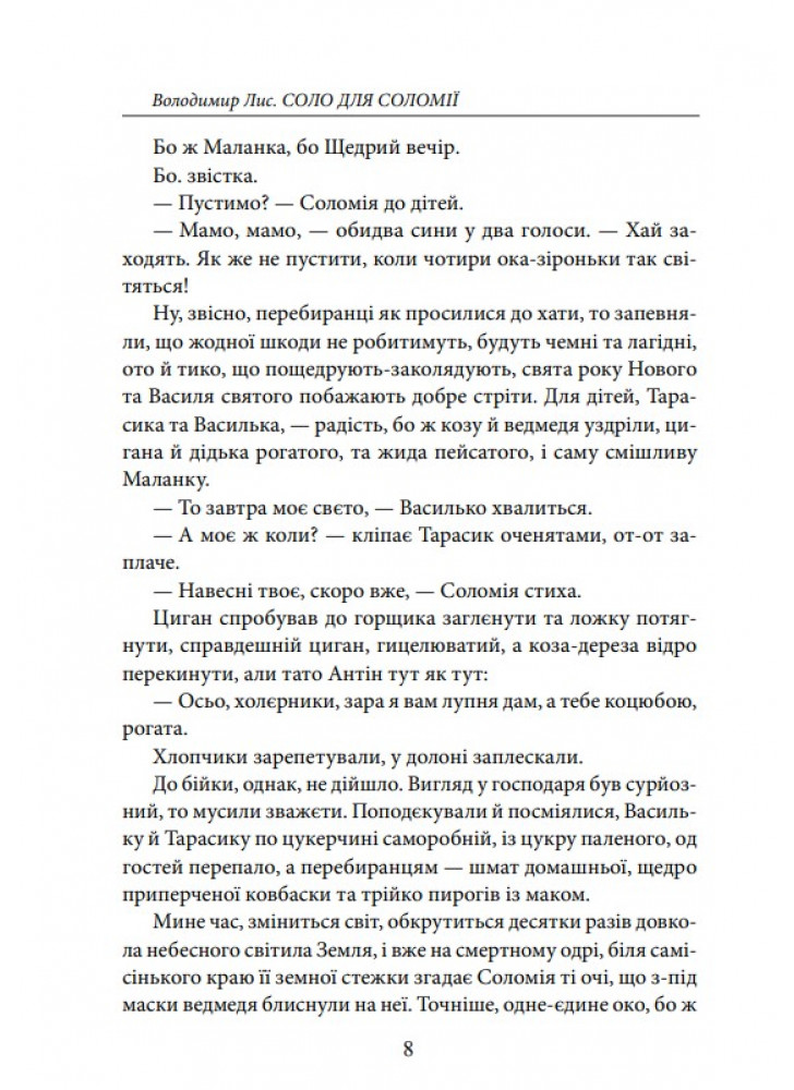 «Соло для «Соломии» — это почти песенный рассказ о нелегкой судьбе женщины, которая, прежде всего стремясь к любви и счастью, проходит сквозь боль, жизненные трудности, потери и разочарования и предстает олицетворением многострадального украинского народа в жестоких обстоятельствах ХХ в. В произведении «Старая холера» рассказ о двух пожилых и одиноких людях и их сложных взаимоотношениях переплетается с историей молодой влюбленной пары, которая, преодолевая испытания и соблазны, борется за свое счастье.