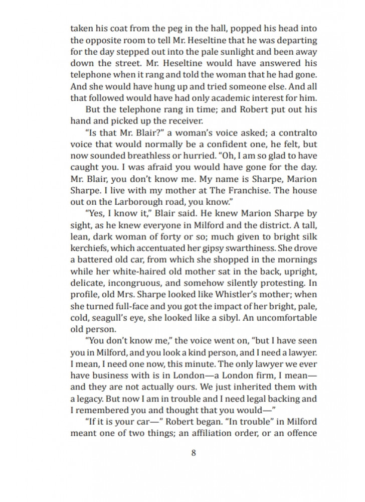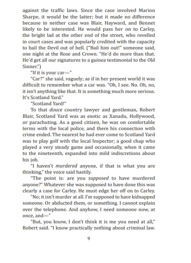 The Franchise Affair is a mystery novel by British writer Josephine Tey (1896–1952). The novel is based on the investigation of the crime of the Sharpe mother and daughter, accused of kidnapping a young girl. Their defense is led by local lawyer Robert Blair. The mystery of the Sharpe family’s guilt or innocence remains until the very end.