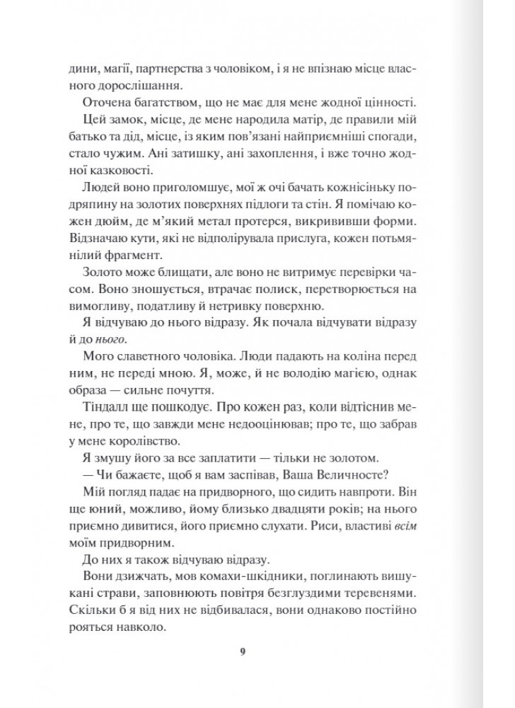 Головна героїня Орінн – дівчина, чия шкіра зроблена із золота, але її життя далеке від ідеального. Рейвен Кеннеді майстерно розкриває тему внутрішньої свободи, досліджує ціну влади та показує, як навіть у найтемніших обставинах можна знайти світло. Атмосфера серії зачаровує, а розвиток героїв і непередбачувані сюжетні повороти тримають у напрузі до останньої сторінки.