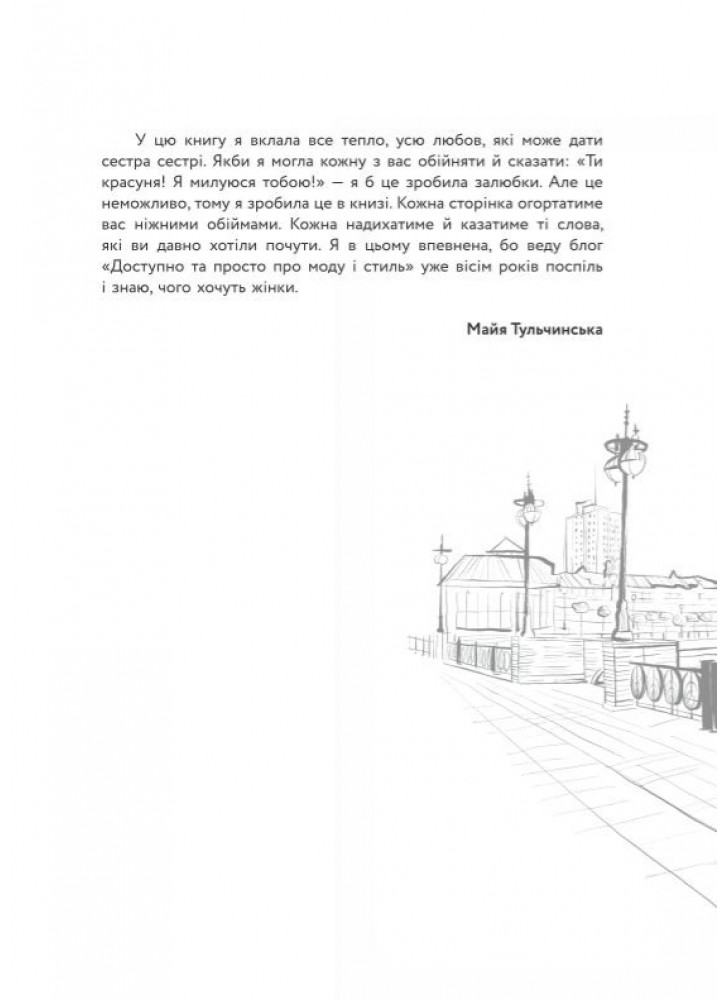 Майя Тульчинська – неправильна модна блогерка і колумністка, яка вважає, що головне в людині – не форми, а те, що всередині. Не шукайте в книзі порад про те, як треба чи не треба, стандартів і типізацій, правил та таблиць. Понад 8 років Майя веде блог “Доступно і просто про моду і стиль”, долучайтеся!