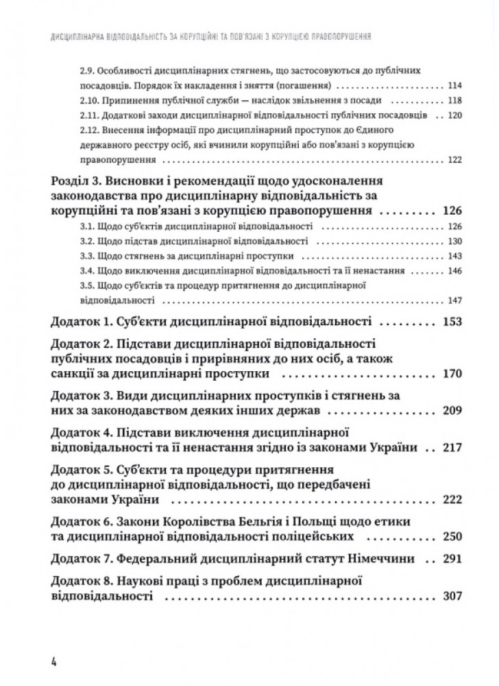 У додатках до книги розміщено, зокрема, закони Королівства Бельгії і Польщі щодо етики та дисциплінарної відповідальності поліцейських, Федеральний дисциплінарний статут Німеччини, а також перелік наукових праць з проблем дисциплінарної відповідальності.