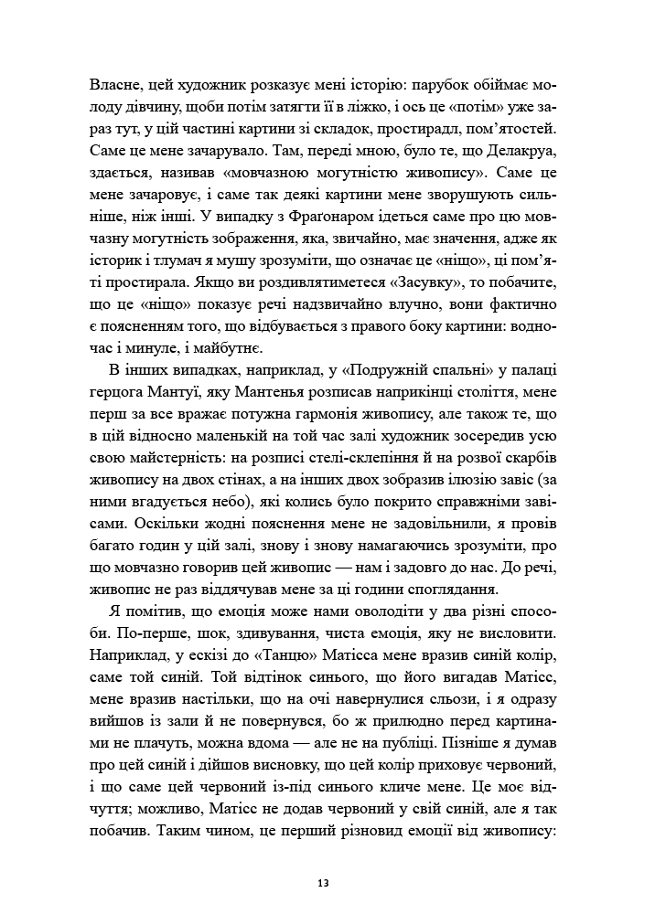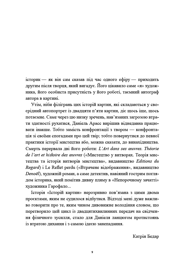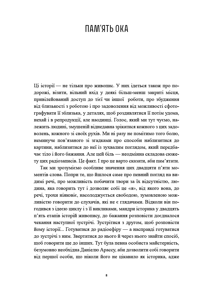 Обращаясь к основополагающим вопросам (перспектива, сюжет Благовещения, роль детали, подъем и упадок анахронизма, реставрация и условия обзора произведений на выставках) он интеллектуально и страстно оживляет ключевые фигуры и стили: Леонардо да Винчи, Микеланджело, Маньер.Его анализ постоянно подпитывается конкретными примерами, кульминацией которых становятся очень специальные аспекты современного искусства. Именно так, через тонкие и открытые прочтения, которые он предлагает, Даниэль Арасс прививает вкус к видению и переосмыслению великих моментов живописи — удивляя, пробуждая и вовлекая нас в настоящую магию своего интеллекта, неизменно приправленного юмором.