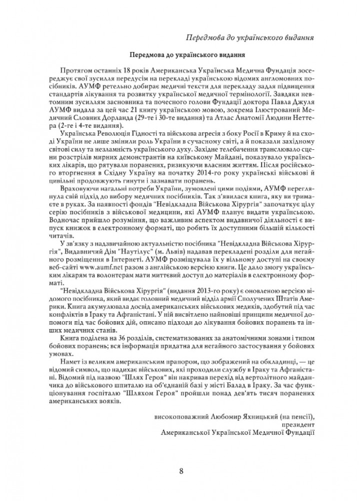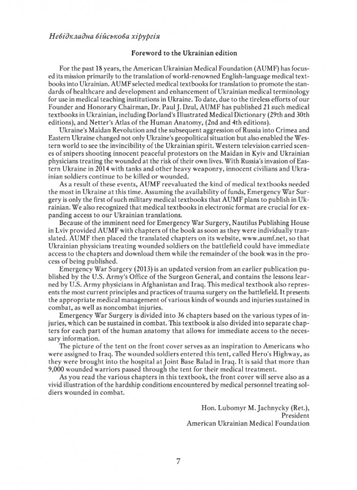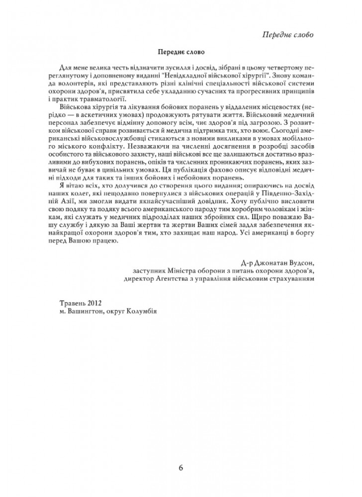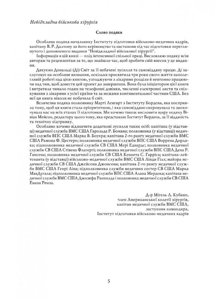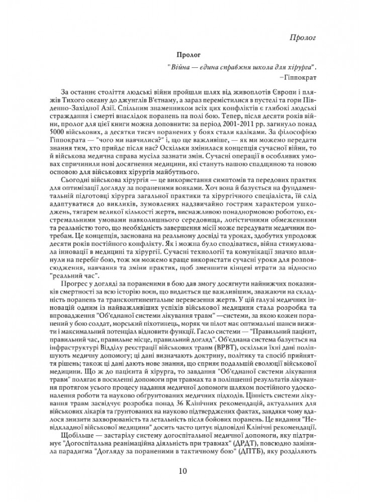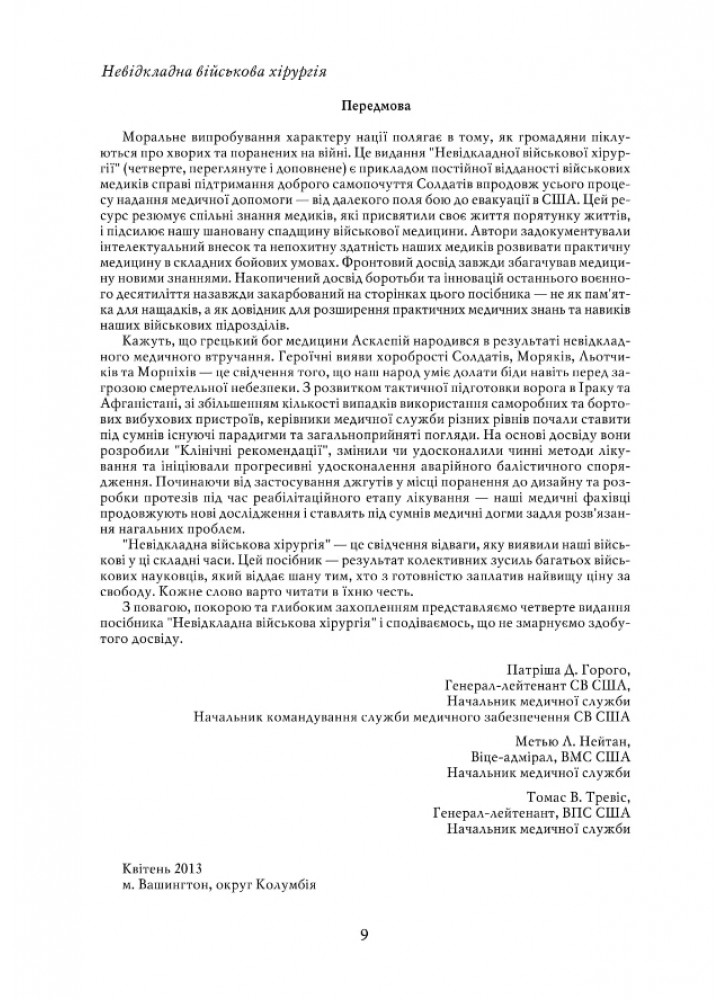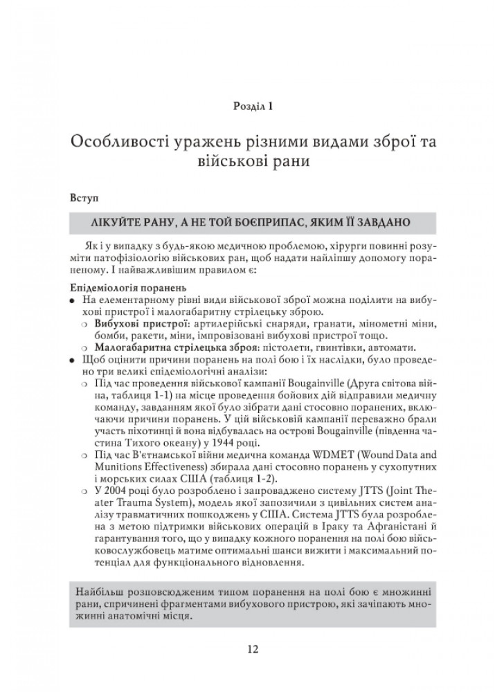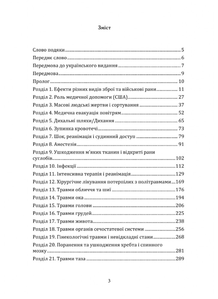 Тридцять шість розділів посібника «Невідкладна військова хірургія», підготовленого фахівцями Науководослідного центру американської військової медицини Borden Institute (Інститут Бордена), докладно описують діагностику та особливості лікування травм різних систем та анатомічних ділянок людського організму, правила сортування та евакуації поранених тощо.