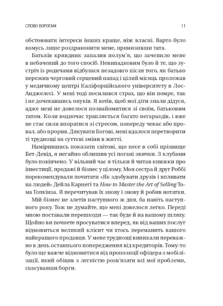 Нонфікшн «Обирайте своїх ворогів мудро» Патрік Бет-Девід і Ґреґ Дінкін розпочинають з аналізу природи ворогів. Вже з першого розділу читачі отримують визначення, хто такі суперники в професійному житті, які бувають їхні види, який вплив вони мають на особистісне зростання людини та наскільки важливо розуміти їхні наміри. Автори переконані: відсутність недооцінки чи страху в комунікації з ворогом зарадить деморалізації, а емоції, викликані суперництвом, можуть слугувати мотивації. Книга допомагає розвинути неупереджену, чітку позицію щодо опонентів, навчитися об'єктивно аналізувати ворога, його стимули й можливості.