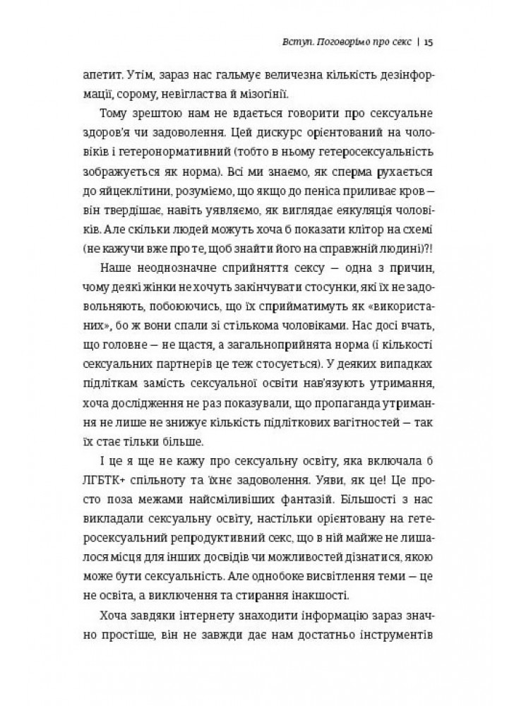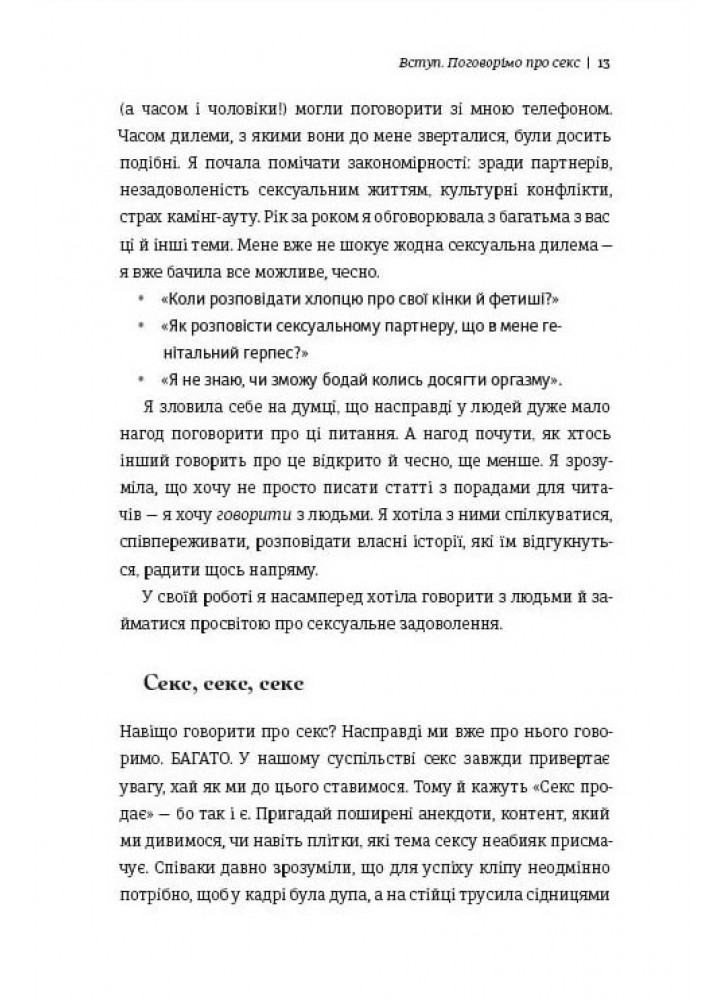 Секс – часть нашей жизни, независимо от того, насколько регулярно мы им занимаемся. И вопрос на самом деле не в том, зачем говорить о сексе, а в том, почему мы не говорим о сексе открыто? Мы обсуждаем другие аспекты жизни, но как только речь заходит о сексе, нам становится неудобно и стыдно. Поэтому мы как общество не осведомлены в этой теме как следует. Мы позволили мифам, религии и массовой культуре создать табу вокруг процесса, влияющего на наше удовлетворение и будущее.
