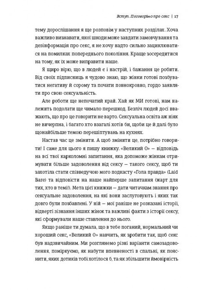 «Великий О. Твой путеводитель по миру любви, свиданий и секса» — секспозитивный манифест, который вдохновляет исследовать себя и учит общаться о сексе с партнером/партнершей. Эта книга развенчивает окружающие сексуальные мифы и углубляется в важные темы, как мастурбация, секс-игрушки, целомудрие, сексуальная идентичность, позы в сексе, без которых со временем не сможешь представить свою жизнь... Олоне, известная педагогица по вопросам секса и отношений в Twitter, помогает женщинам исследовать, выражать и принимать свою чувственную и сексуальную сущность. Она широко исследовала темы секса, отношений, согласия, девственности, сексуального здоровья и ряда других важных тем.