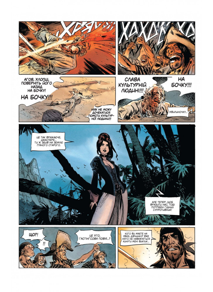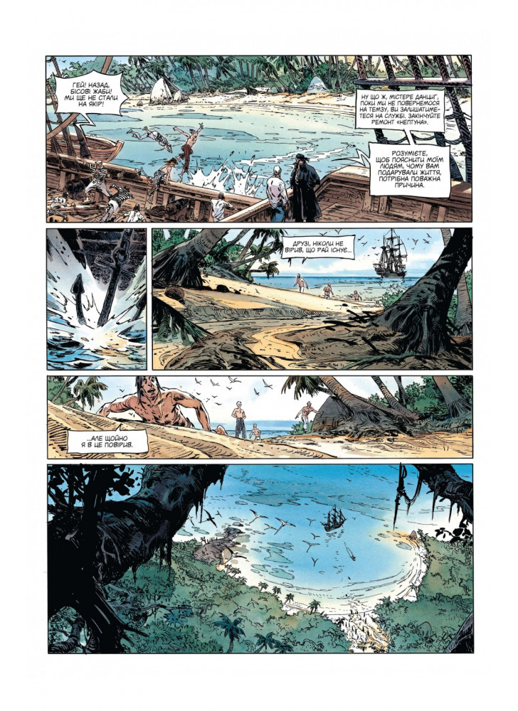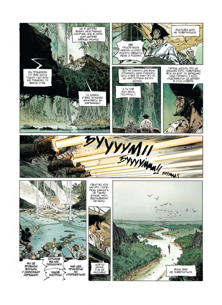 Поэтому она убеждает доктора Ливси помочь ей встретиться с пиратом Длинным Джоном Силвером и его «береговыми братьями», чтобы заключить с ними договор. Все садятся на корабль «Нептун» только с одной целью – завладеть сокровищами инков. Во время перехода через океан Силвер совершает мятеж и захватывает корабль. Моряки и пираты теперь свободны, но совершенно растеряны, потому что приближаются к неизвестным берегам, извещающим, что это наконец... Новый Свет. Эта жестокая и полная приключений рисованная история от мастеров франко-бельгийской школы сценариста Ксавье Дорисона и художника Матье Лоффре является настоящим бриллиантом из коллекции бандесине и будет интересна всем поклонникам остросюжетного приключенческого жанра. А также позволит читателям оценить непревзойденный европейский рисунок.