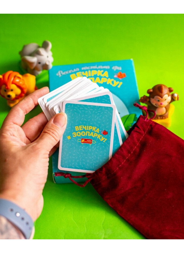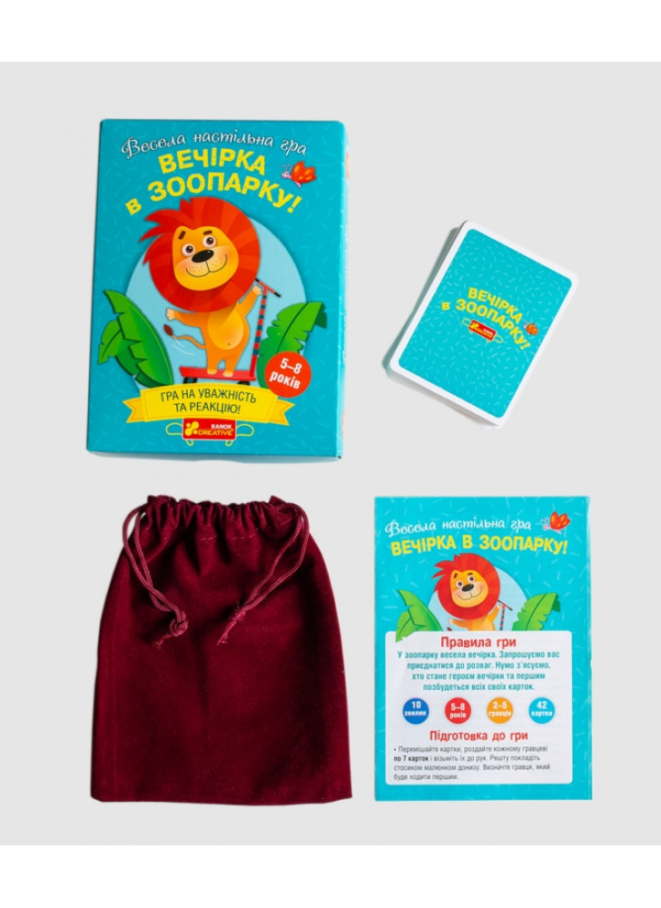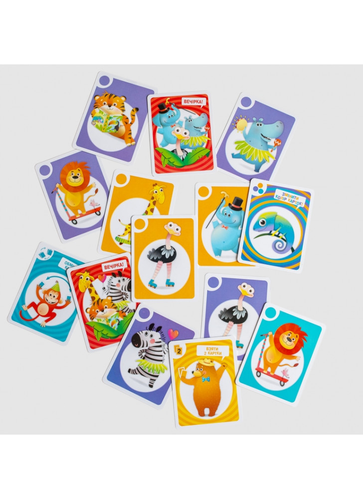 Весела настільна гра «Вечірка у зоопарку» — це шалене свято тваринок, до якого запрошено і вас! Яскрава, динамічна гра, яка точно сподобається дітям від 5 до 8 років! Правила прості, а емоції — справжні! Завдання — швидко реагувати, бути уважним і першим позбутися всіх карток, щоб стати зіркою зоопаркової вечірки. Це більше, ніж просто настільна гра – це вибух радості, навчання та емоцій у кожному раунді!