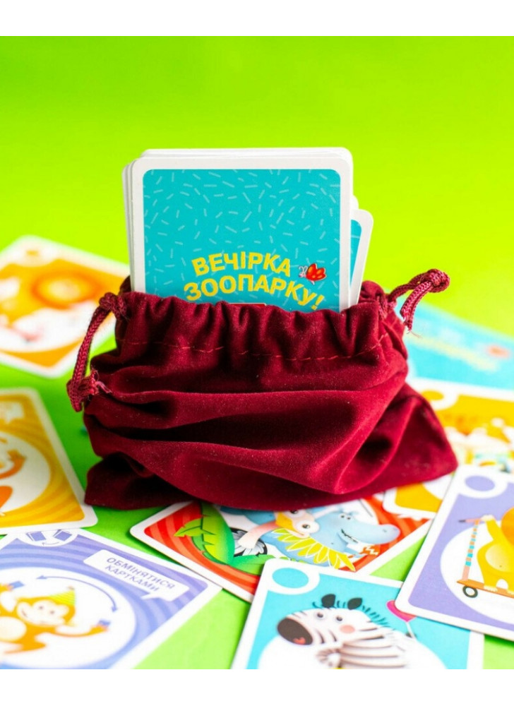 Унікальні переваги гри «Вечірка у зоопарку»: Компактний формат — зручно брати із собою у подорож, на прогулянку чи в рюкзак до школи. У комплекті — стильний велюровий мішечок для зберігання карток Оригінальна тематика — вечірка в зоопарку з веселими тваринами, яскравим дизайном і кумедними завданнями створює особливу атмосферу гри. Ідеальна тривалість — партія займає лише 10 хвилин, що підходить для активних і непосидючих дітей.