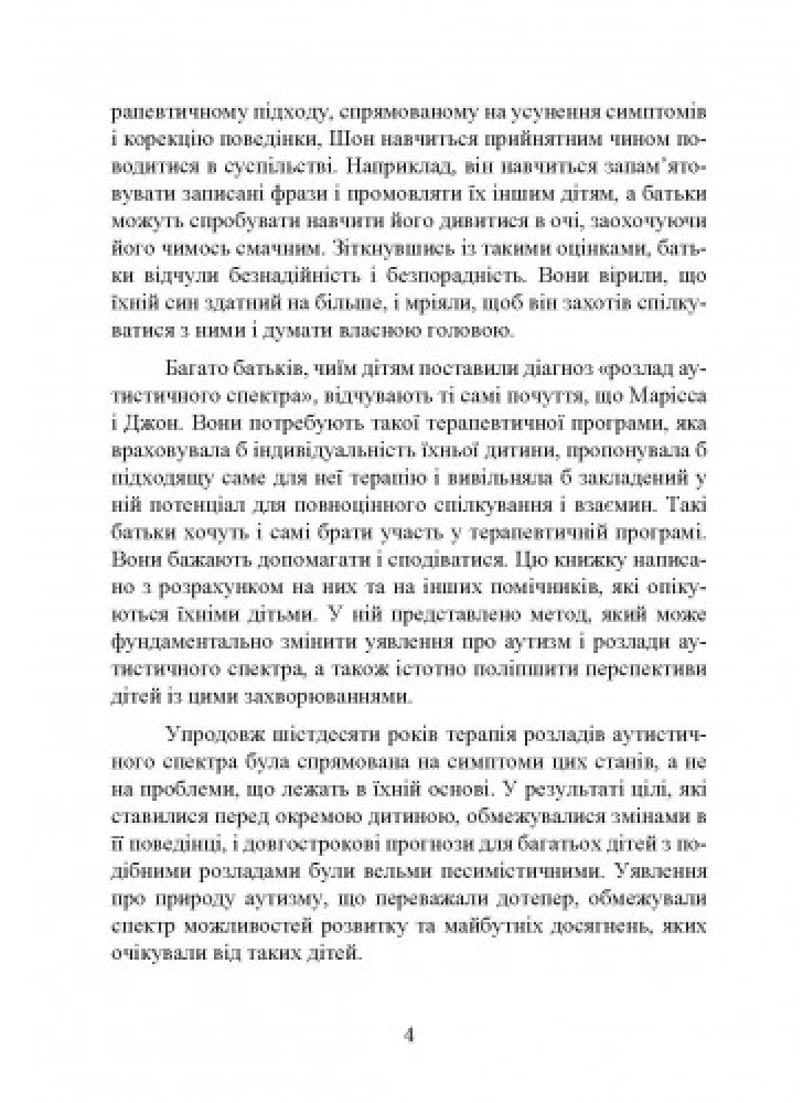 Для оценки достижений выделяются такие параметры как эмоциональная теплота, способность строить отношения с людьми, способность к творческому мышлению и осмысленному общению. Занятия проводятся в атмосфере эмоционального контакта, в них принимают участие не только специалисты, но и вся семья, и в результате навыки общения и мышления быстро входят в повседневную жизнь. Книга адресована родственникам людей с расстройствами аутистического спектра, работающим с ними специалистам, а также студентам – психологам, педагогам и другим.
