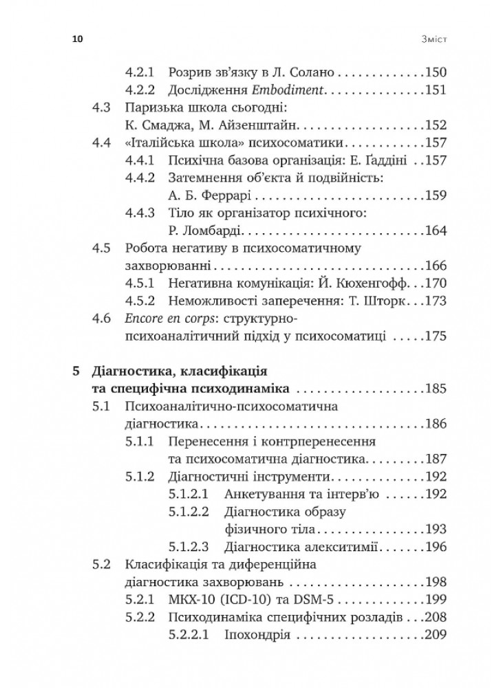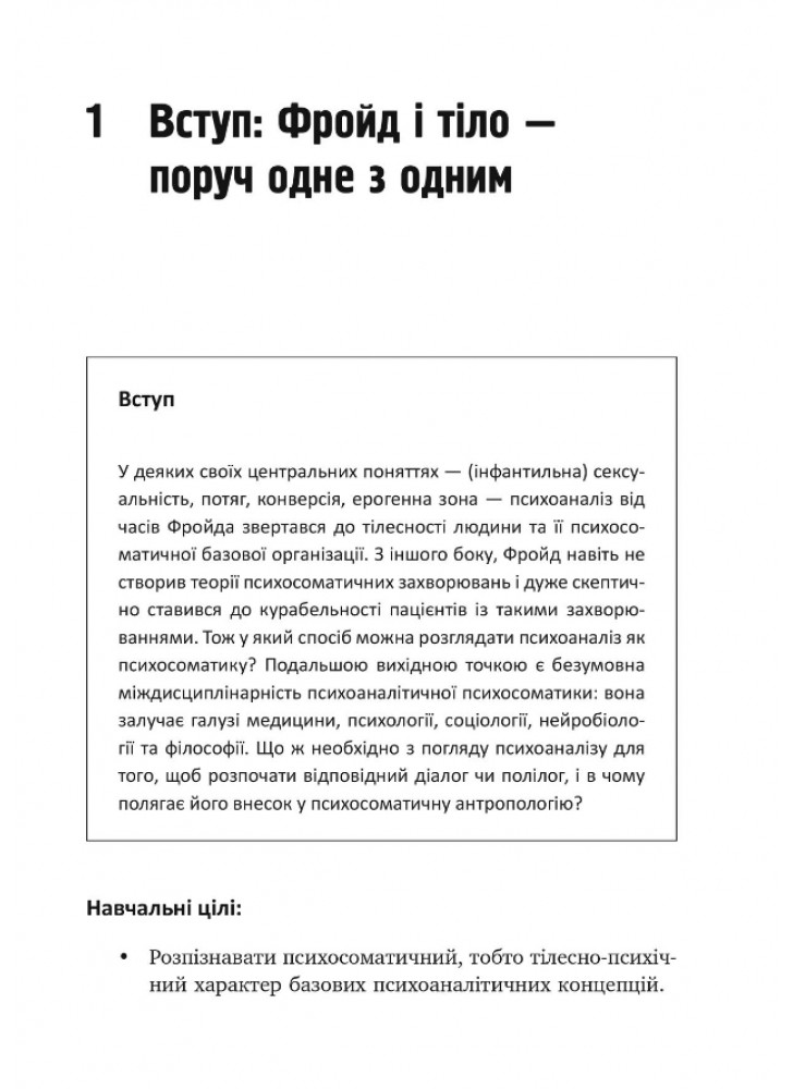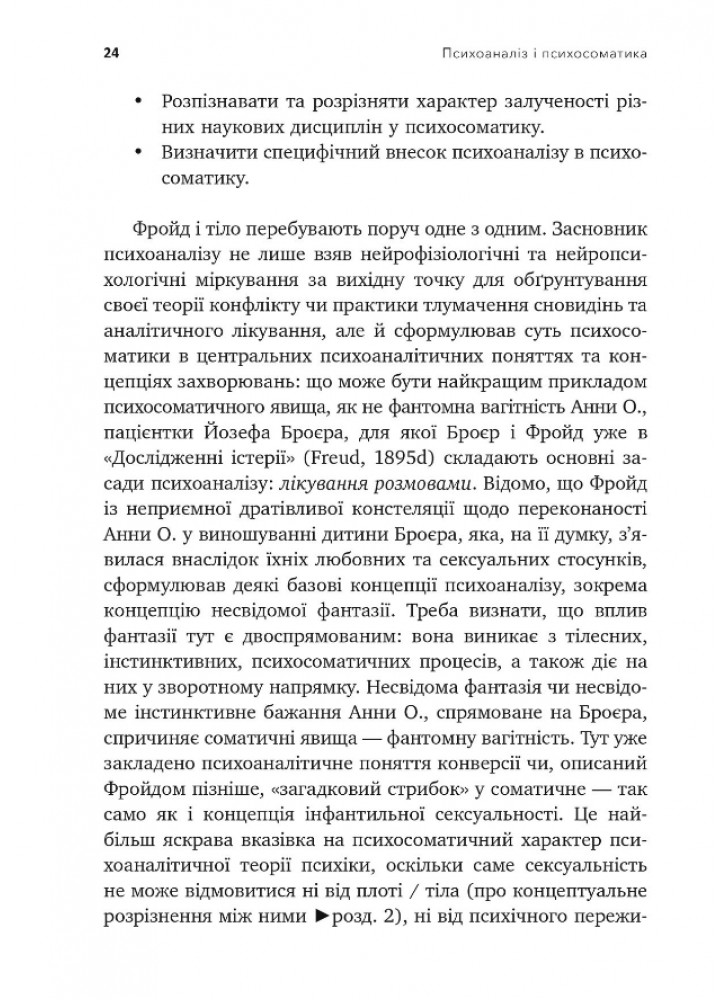Автор розвиває концепцію тілесності для обґрунтування тісної взаємодії між психікою і сомою. Саме тіло залишається вихідною і центральною точкою для психоаналізу, тому психосоматика може трактуватися навіть не як суміжна дисципліна, а як невід’ємна складова психоаналітичного погляду на людину. Крім базових теоретичних концептів, автор звертається до практичних питань психоаналітичної психосоматики, зокрема її ефективності й принципів лікування в умовах стаціонарного сетингу.