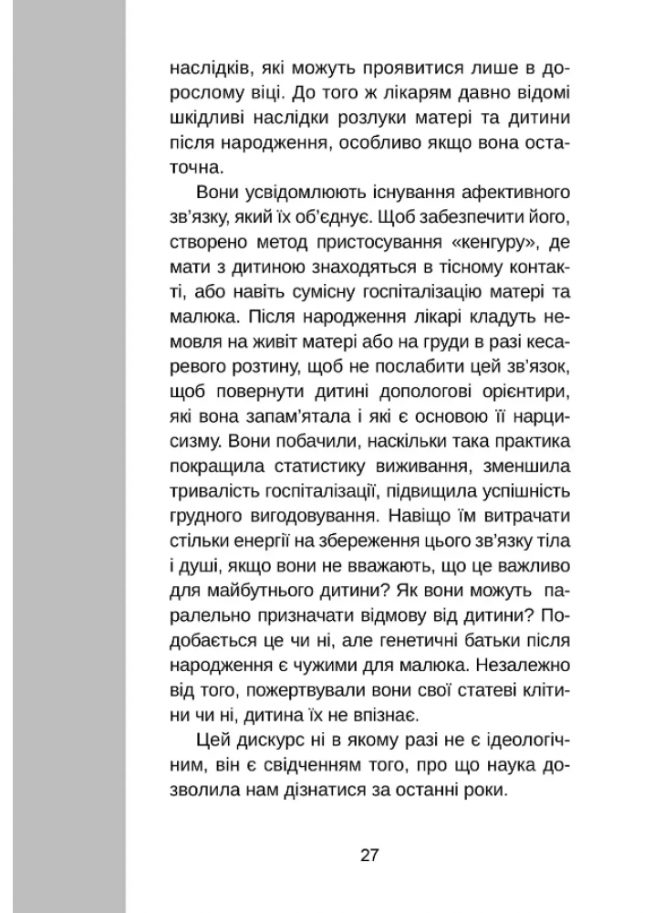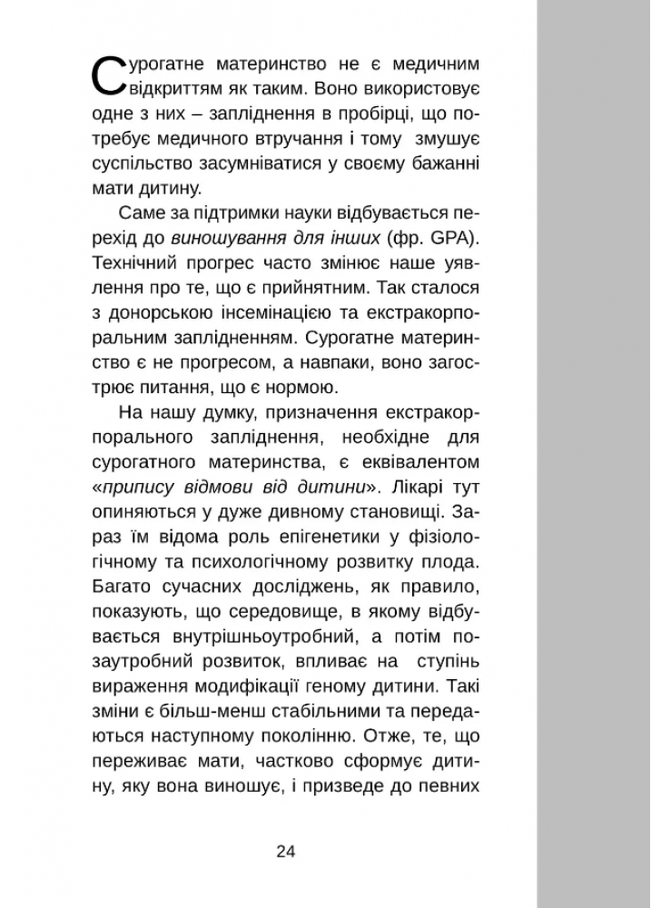 Учитывая сегодняшние подходы, мы не можем рассматривать вопросы отказа от детей, усыновления, суррогатного материнства и продолжения рода с помощью медицинских средств только через призму хороших чувств. Вопрос родства – это не только механическая история взаимодействия матери и ребенка. Оно оказывает влияние как на семью, так и на общество в целом, благодаря трансформации вытекающих из него семейных законов. Отрицание всех этих элементов, касающихся родовой жизни и связей, порождает эту очень спорную практику и игнорирует тех, кто является ее объектами: как матерей, так и детей.